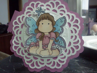 I coloured the image in copics and then used bits and pieces I have been purchasing to embellish. I cut out this weird shaped card just to have something different but then couldn't work out the best way to stand it ... ended up going on the side. I embossed the circle in the middle, not that you can see it that well. and mounted this image with foam tape to give it a bit of depth. I'm very happy with the colours. This is a lovely image to colour.